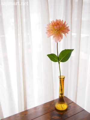 クリスマスな雰囲気そっちのけで、サーモンピンクのダリアを。柔らかいけど逞しい。アイビーやグリーンを垂らすように飾ってもいいかも。