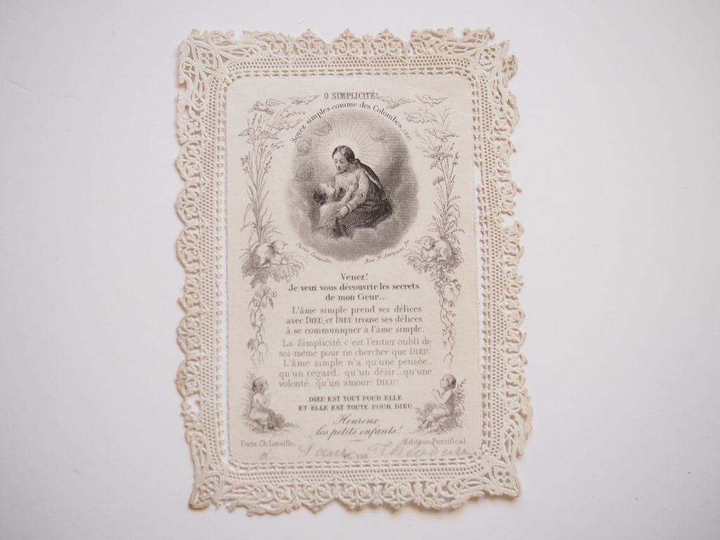 カニヴェは、カトリックの聖画を、エンボスを施したレース状の切り絵細工 (papier découpé) で飾った古い時代の信心具で、当初主にカルメル会の修道女たちによって製作されました。修道女たちは鵞ペンの先を削る小型ナイフ(カニフ)と小さなハサミを巧みに使って、聖画の周囲にレース状の切り絵細工を施したそうです。「カニヴェ」(canivet) という名称は、このナイフ(カニフ canif)に由来するそう。