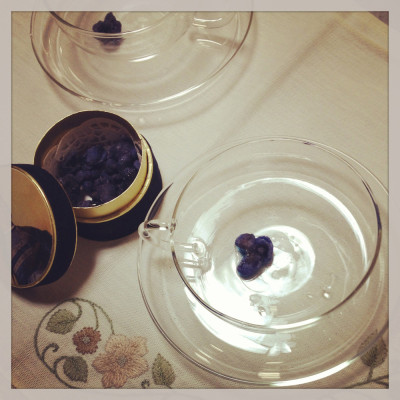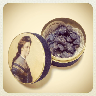 お土産の「スミレの砂糖漬け」。なんてうっとりするパッケーじなのでしょう。サイドにみえる青い帯はベッチン布地。オーセンティックでロマンのある小さな一箱にため息がでます。